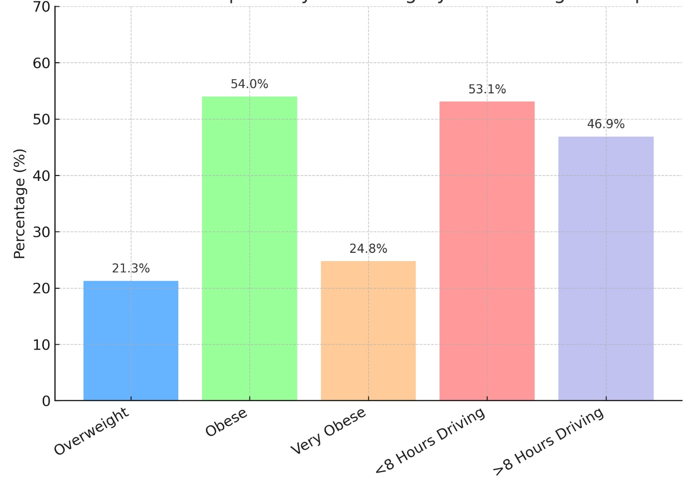 The visualization highlights a higher prevalence of obesity among individuals who reported longer driving hours, suggesting a potential relationship between sedentary occupational exposure and increased body mass index.