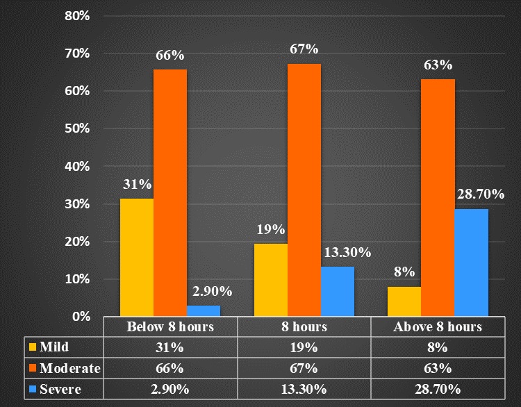 The association between working hours and NPRS. The results show that among all workers who works for less than 8 hours 31.4% had mild, 65.7% had moderate and 2.9% had severe pain. While among those who works for 8 hours 19.4% had mild, 67.3% had moderate and 13.3% had severe intensity of pain. While those who work for above 8 hours, 8% had mild, 63.2% had moderate and 28.7% had severe pain. In this case low p-value (<0.001) suggests that observed differences in NPRS level among the categories of working hours per day are statistically significant. This implies that there is likely a meaningful relationship between the levels of NPRS and working hours of workers in different workplaces. (Figure 1)
