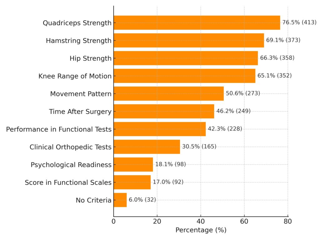 Only 5.9% of the physical therapists did not mention any precise standards for return to sports approval. Maximum of the return to sports consent standards/parameters were related to physical aspects and the bulk of the physiotherapists stated numerous uses of quadriceps strength (76.5%), hamstring strength (69.1), hip muscle strength (66.3%), and knee ROM (65.1%) (Figure 1).