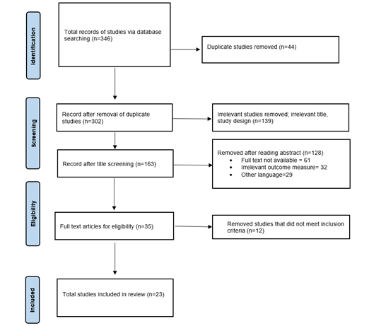 Number of total articles found were three hundred and forty-six. Three hundred and two records were screened after duplicate articles were eliminated. Twenty-three records were included in this study after full text evaluation.