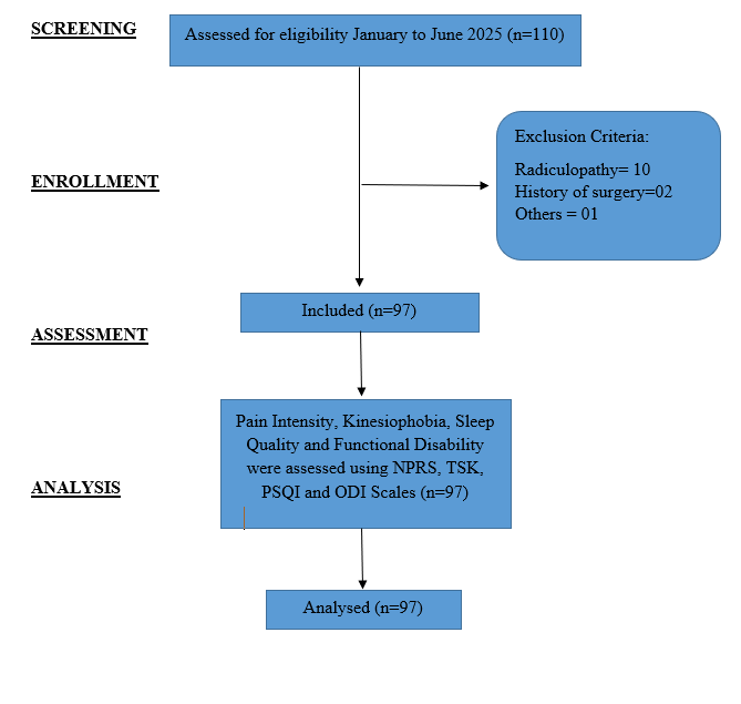 The cross-sectional study was conducted over six months from January to June 2025 at the University of Lahore. The data was collected from the medical and physiotherapy outpatient department of the University of Lahore Teaching Hospital, Lahore. This study was conducted following the guidelines of Strengthening the Reporting of Observational Studies in Epidemiology (STROBE) as shown in Figure 1. Ethical approval was obtained from the Research Ethical Committee of the University of Lahore (REC-UOL-/253/08/24). The sample size of 97 was calculated through an online sample size calculator for correlation analysis using the value of the correlation coefficient of kinesiophobia with pain intensity, r=0.281 (13),ꞵ =0.20, and α=0.05 with the given formula; N = [(Zα+Zβ)/C]2 + 3. The participants were recruited through a non-probability convenience sampling technique, and pre-defined eligibility criteria were applied to all the eligible participants to minimise sampling bias. Written informed consent was taken from all the participants at the time of recruitment into the study. The study’s objective was explained to them, and confidentiality and anonymity were ensured, while keeping the right to withdraw from the study.